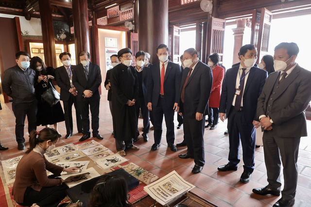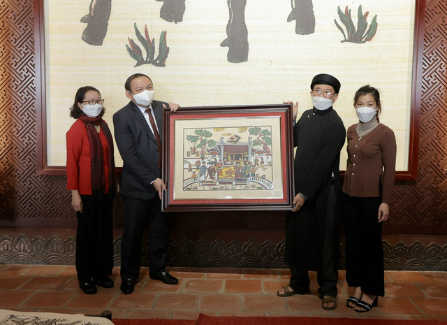 Bộ trưởng Nguyễn Văn Hùng đến thăm Trung tâm bảo tồn tranh Dân gian Đông Hồ và xem các nghệ nhân trình diễn nghề làm tranh Đông Hồ.