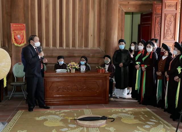 Tại Nhà chứa Quan họ, Bộ trưởng Nguyễn Văn Hùng cùng đoàn công tác đã được nghe các nghệ nhân nơi đây chia sẻ nhiều tâm tư, nguyện vọng và biểu diễn các điệu hát dân ca Quan họ truyền thống của địa phương.