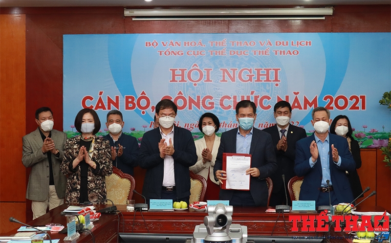 Đại diện các Vụ, đơn vị của Tổng cục Thể dục thể thao đã cùng ký cam kết thi đua năm 2022 - Ảnh: Quý Lượng