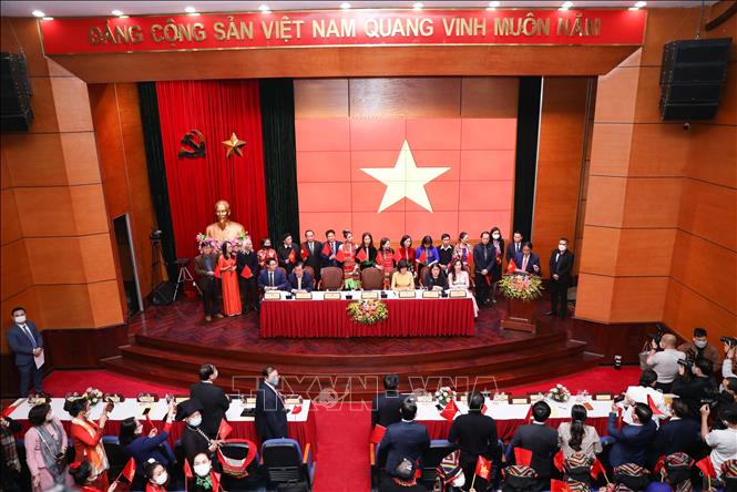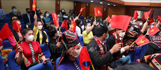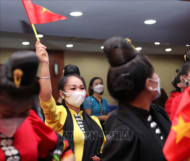 Giây phút Nghệ thuật Xòe Thái của Việt Nam chính thức được UNESCO ghi danh vào danh sách di sản văn hóa phi vật thể đại diện của nhân loại tại đầu cầu Bộ Văn hóa, Thể thao và Du lịch tại Hà Nội - Ảnh:TTXVN