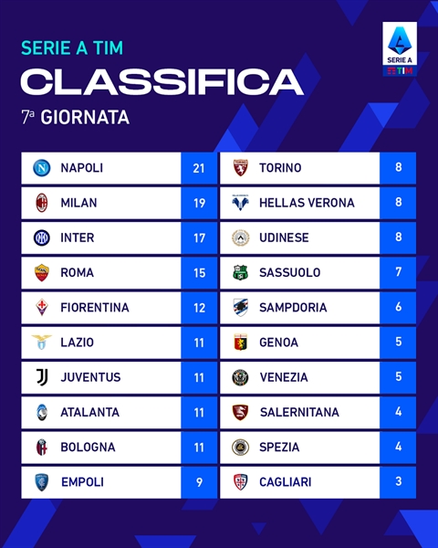 Bảng xếp hạng Serie A 2021-2022 sau 7 vòng đấu
