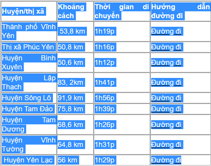 Khoảng cách từ các Huyện, Thị Xã ở Vĩnh Phúc đến Hà Nội bao nhiêu km?