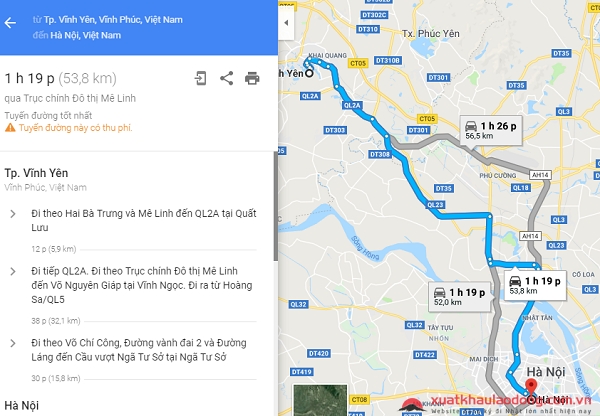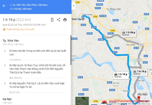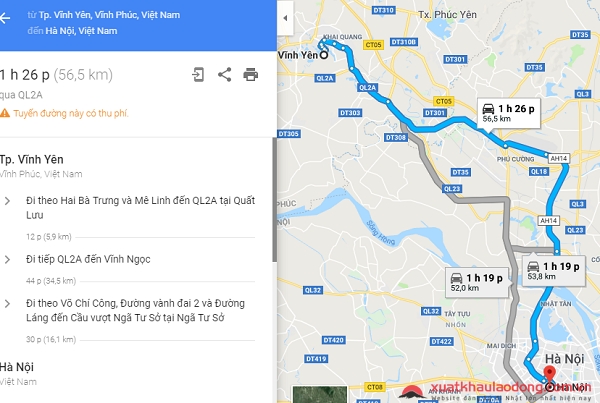 Tuyến đường 2: Qua quốc lộ 2A, khoảng cách là 56,5 km, thời gian đi bằng ô tô mất 1 giờ 26 phút